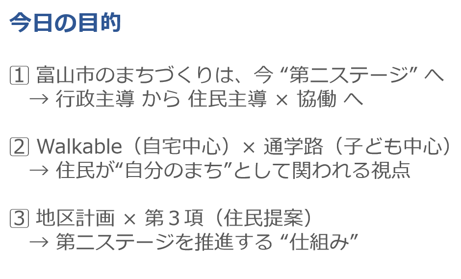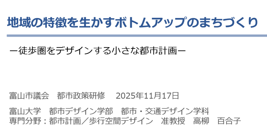 例えば、線引き都市計画は学校配置を今になっても配慮しないことから、通学はWalkable(ウォーカブル)でなくなろうとする地域が出始めています。また、都市デザインの権限は、87%が市の判断で行われる様になったともお話されたのですが、それは富山市の一部についての話に他なりません。